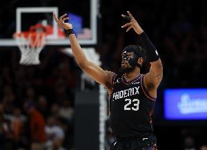 太阳球员古德温在上场比赛表现车色的情况下,本场比赛上半场延续火热状态,三分线外百发百中。