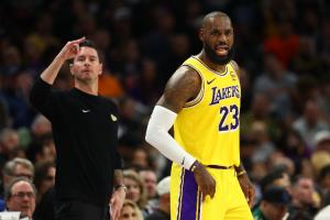 赛后,湖人主帅雷迪克接受了记者采访。他打趣道:“有时候勒布朗会叫我滚开(Fu** off ),然后他自己叫战术。”
