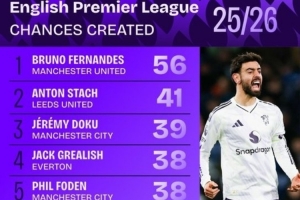 体育资讯1月9日讯 数据机构squawka统计了本赛季英超创造机会榜,曼联队长B费断崖领跑。
