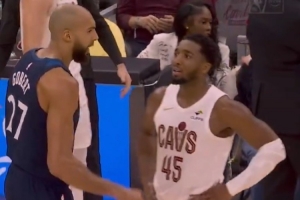 体育资讯1月11日讯 昨日NBA常规赛,骑士主场146-134战胜森林狼,前爵士队友米切尔与戈贝尔在比赛中互动。