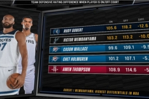 防守效率差:球员在场和不在场时,球队每百回合失分差。
