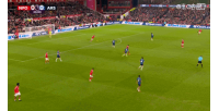 上半场即将进入补时阶段时,阿森纳门将拉亚出击到本场边线附近险些送给对手一个空门机会;他第一下的铲球踢呲了,但随后快速起身将球踢出边线。