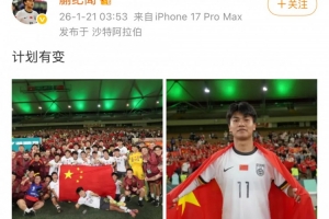 赛后为U23国足首发出战的蒯纪闻更新社媒,晒出赛后全队合影以及自己身披国旗的照片,并配文写道:“计划有变”,