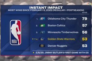 巴特勒于2025年2月8日首次为勇士出战,此后球队在常规赛与季后赛共取得53胜,和掘金并列联盟第四好