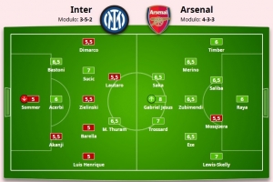 国米:索默-5分、阿坎吉-5.5分、阿切尔比-6分、巴斯托尼-6.5分、路易斯·恩里克-5分、巴雷拉-5分、泽林斯基-5.5分、佩塔·苏契奇-7分、迪马尔科-5.5分、马库斯·图拉姆-6.5分、劳塔罗-5.5分、埃斯波西托-6分、弗拉泰西-5.5分、齐沃-6分