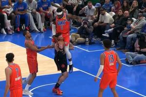 又来一肘!巴恩斯起身肘翻切特 吹了进攻犯规回看后没有升级