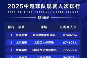 根据中足联的数据,2025年,中超、中甲和中乙三级职业联赛票房总收入达到了6.4亿元人民币,增幅高达38.12%,其中中超联赛16家俱乐部票房总收入达到了5.81亿元。据《足球》报报道,有2家俱乐部票房收入超过了1亿元人民币。