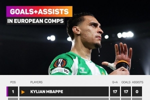 体育资讯1月30日讯 数据显示,自安东尼加盟贝蒂斯以来,他在欧战参与进球数仅次于姆巴佩。