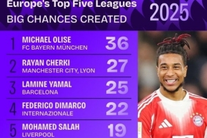 体育资讯12月31日讯 2025年即将结束,数据机构squawka也统计了本年度五大联赛创造重大机会情况,奥利塞独自领跑。