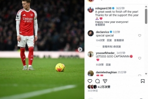 本场比赛厄德高送出精彩助攻,他也在个人社媒晒出本场照片,配文写道:“以出色的一周结束今年赛程,感谢大家一年以来的支持,祝大家新年快乐!”