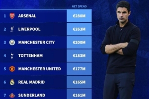 本赛季转会净支出排行:阿森纳2.8亿欧第一,英超包揽前五