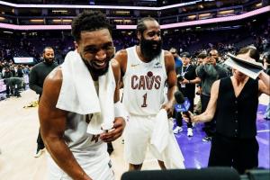 “才打了一场比赛!我们就这么猛了?我们在干嘛啊?JH(James Harden),你太TM牛X了!”一旁的米切尔也被逗笑。