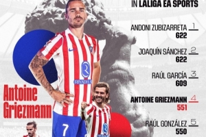此役过后,格列兹曼已经在西甲出战551场比赛(204球97助),成为西甲历史出场第四多的球员。
