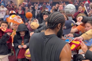 赛前,哈登为众多主场的小球迷们签名。