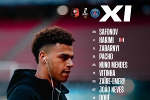 巴黎首发:39-萨福诺夫、2-阿什拉夫、6-扎巴尔尼、51-帕乔、25-努诺·门德斯、17-维蒂尼亚、33-扎伊尔·埃梅里、87-若昂·内维斯、14-杜埃、7-克瓦拉茨赫利亚、10-登贝莱