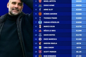 1、瓜迪奥拉(曼城):10.3亿欧