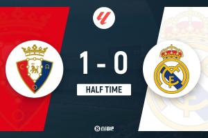 半场结束,皇马暂0-1奥萨苏纳。