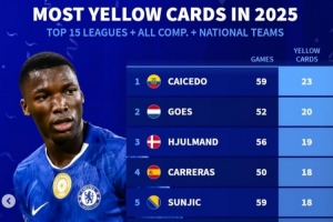 体育资讯1月4日讯 2025年已经过去,《转会市场》也统计了前15联赛球员的俱乐部+国家队各项赛事总黄牌次数,凯塞多居首。